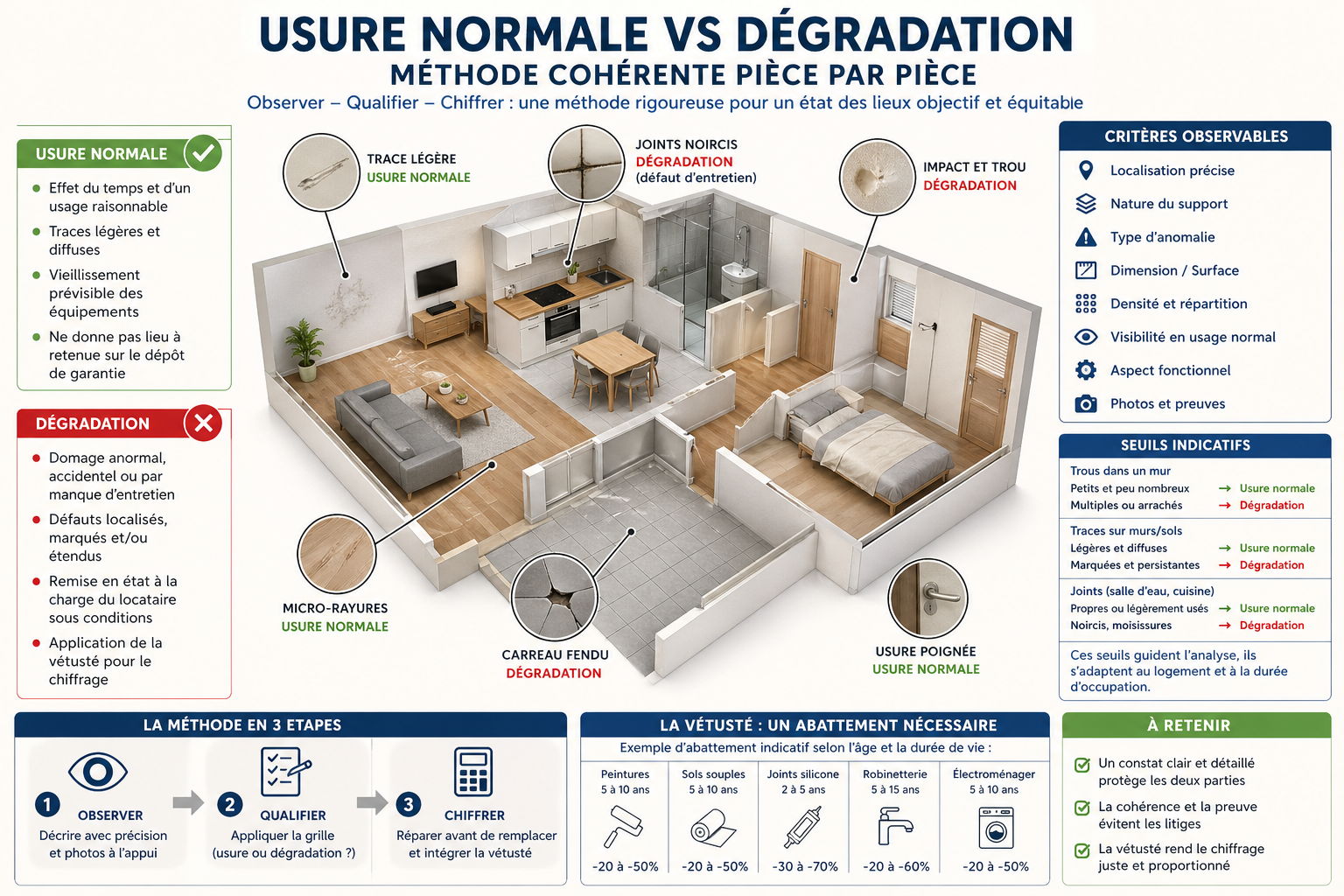 Dans la réalité, cette distinction demande de la nuance. Une peinture ternie après plusieurs années n’a pas la même portée qu’un mur troué, qu’un parquet brûlé ou qu’une porte cassée. De la même manière, une robinetterie entartrée, des joints noircis faute d’entretien, un four très encrassé ou un siphon obstrué n’entrent pas dans la même logique que la simple vétusté. C’est précisément là qu’un regard indépendant apporte de la valeur : il aide à objectiver la situation, sans exagérer ni minimiser.