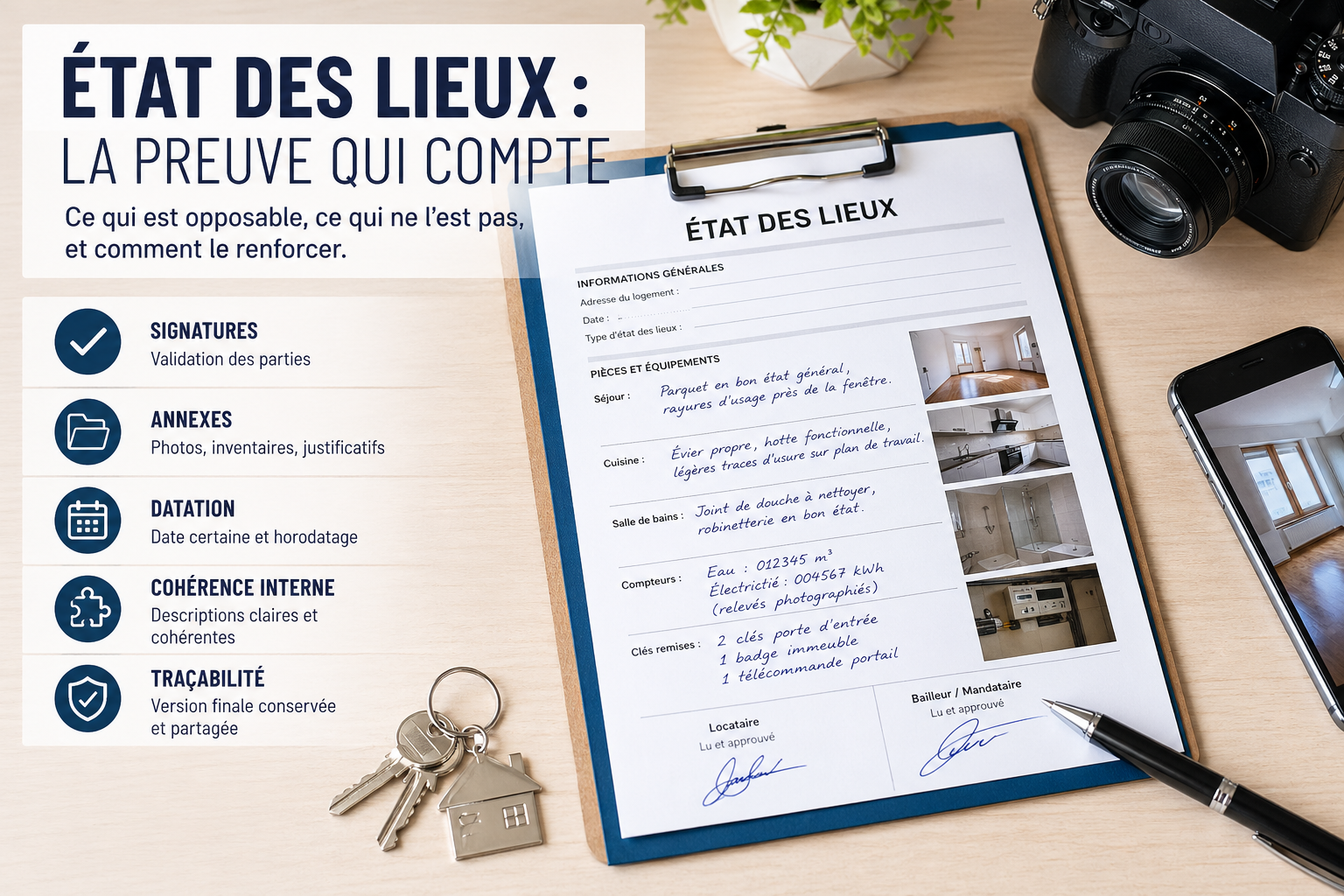 Les photos horodatées renforcent fortement la lisibilité d’un constat. Elles permettent de visualiser l’état d’une pièce, d’un équipement ou d’un désordre à une date identifiée, ce qui limite les contestations sur la chronologie. Elles sont particulièrement utiles pour les traces d’humidité, fissures apparentes, chocs sur menuiserie, encrassements importants, dommages sur mobilier, état des appareils électroménagers et relevés de compteurs.